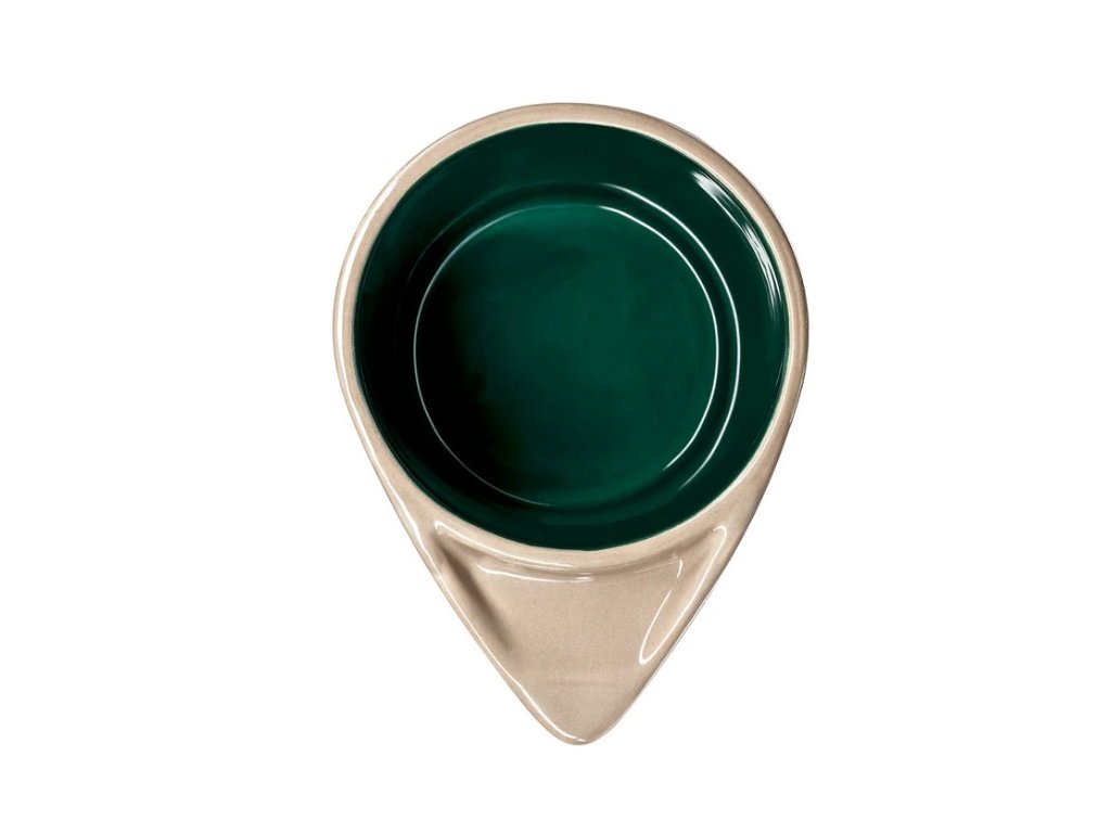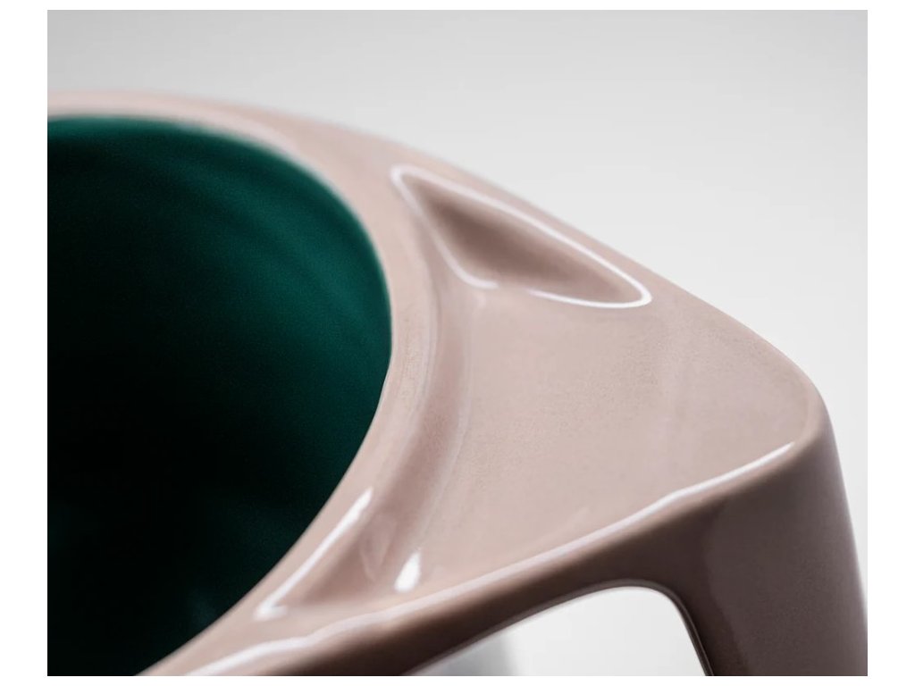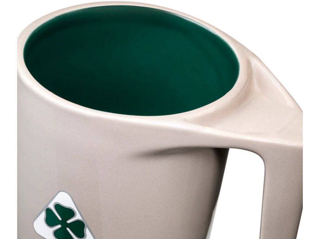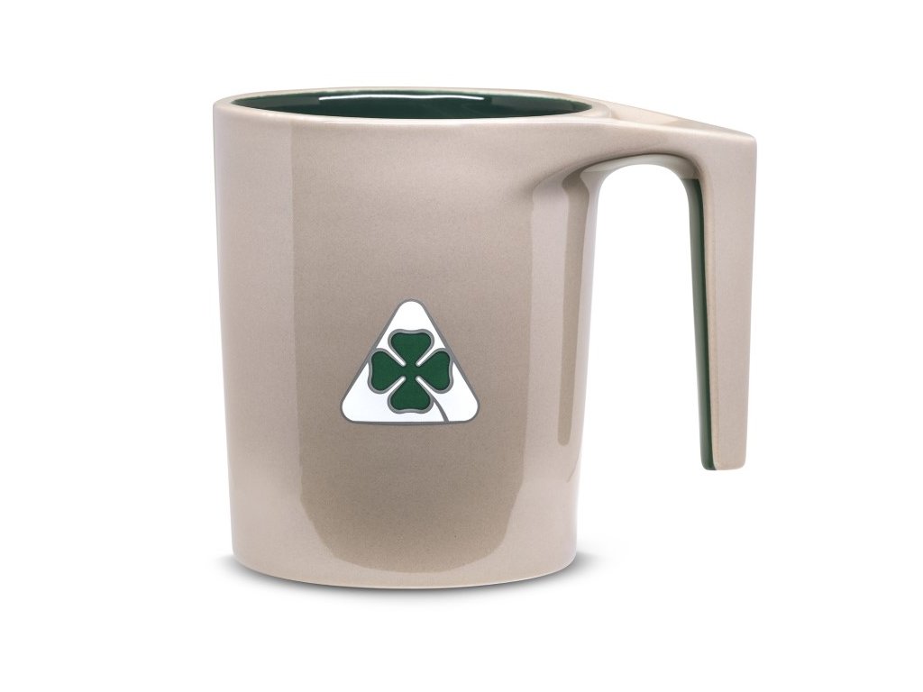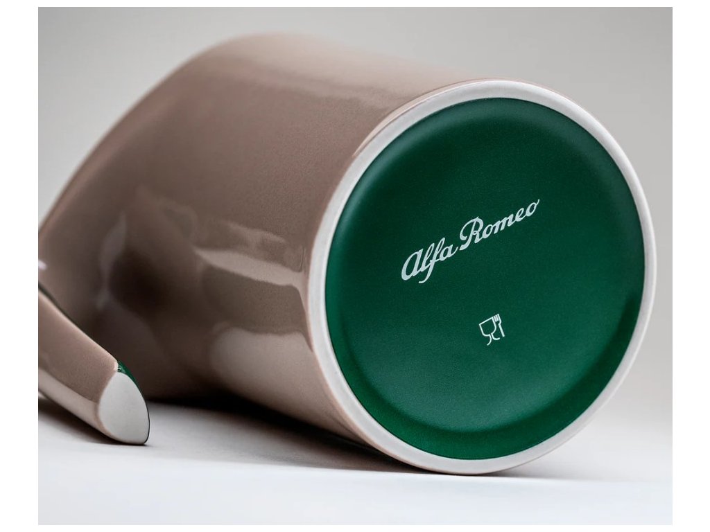 Porcelánový hrnek s aerodynamickým tvarem v béžové barvě se zelenou barvou uvnitř, logem Quadrifoglio na boku a logem Alfa Romeo na dně.