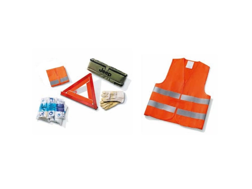 Lékárnička v brašně s logem Jeep. Včetně výstražného trojúhelníku. Balení obsahuje 2x vestu a rukavice.